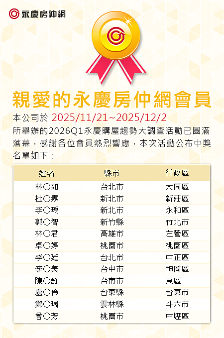 2026 Q1 永慶購屋趨勢大調查客戶回函中獎名單