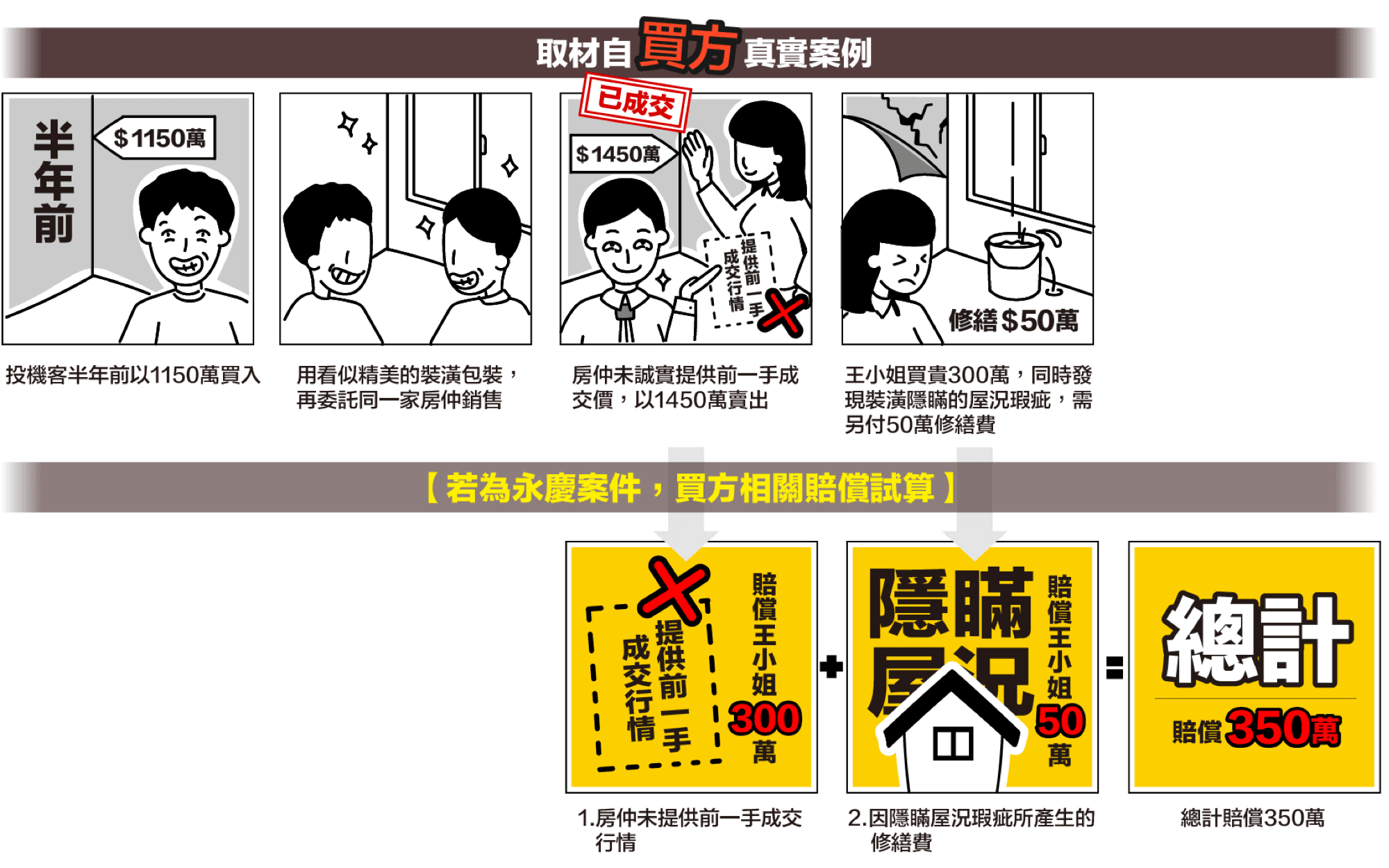 若賣方取得未滿一年,用不良裝潢掩飾屋況瑕疵,本公司賠償修繕費用最高新台幣一百萬元。