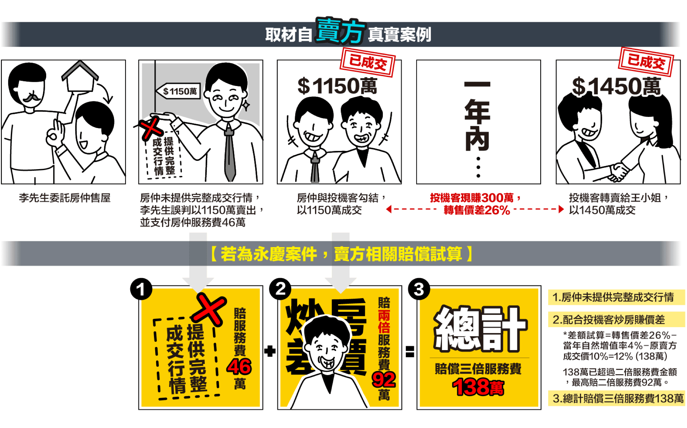 若賣方取得未滿一年,本公司未告知賣方取得價格,導致買方高買,本公司最高賠償新台幣參佰萬元。